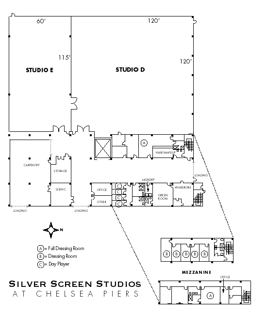 Oversized stage doors allow Studios D & E to be combined, creating over 20,000 square feet of sound stage space. The support space includes two (2) floors of dressing rooms, large carpentry / scenic shops, storage facilities, wardrobe, hair and make-up rooms, casting facilities, and an oversized working corridor. Additional office space available. Monthly Rental Fee includes Support Space. Additional Charges: Utilities, Trash Removal (Action Environmental) and Parking.